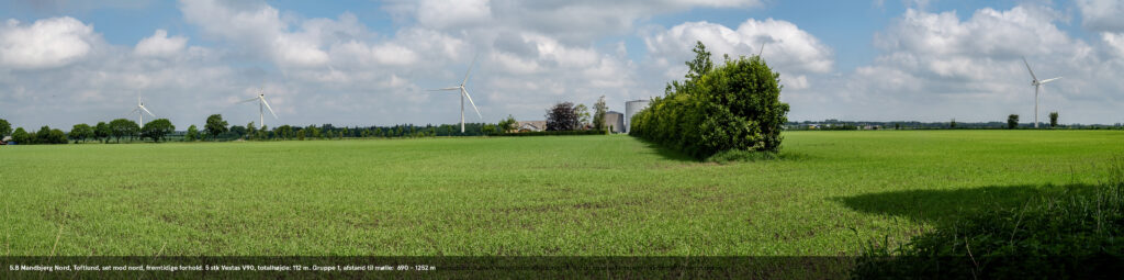I vores ansøgning til Tønder Kommune har vi på hver af de to placeringer i henholdsvis Toftlund og Hønning valgt at ansøge om 5 vindmøller med en totalhøjde på omkring 110 m til vingespids.